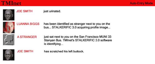 “I didn’t even opt for the auto logging function. It kind of just turned itself on. I kept trying to turn it off, but it wouldn’t go off. The next thing I knew, it was auto-adding everyone I’d ever met in my life. I mean, people I didn’t even know but just stood next to in the elevator on the way to work, were popping up like crazy. I now have 3,500,301 people in my network, and it just keeps going up every time I look. And it posts EVERYTHING about them, I mean, EVERYTHING. The last time I looked it was telling me that someone named Amy Dunaway had just popped a pimple on her ass. Seriously. I did not need to know that. Seriously. I barely know her.”