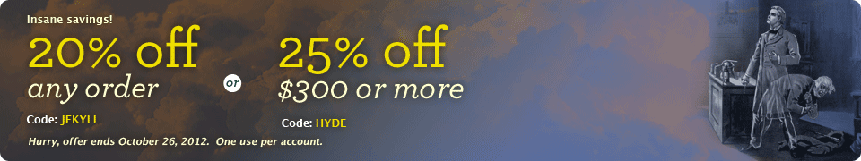 Enter the “JEKYLL” code and get 20% off any (or all) of the Lulu editions of my books for a hauntingly good read – just in time for Halloween! The offer is good for the next three days only… through October 26th. You can get any of my full length novels, or my new short story anthology, “Things That Go Bump In My Head”.