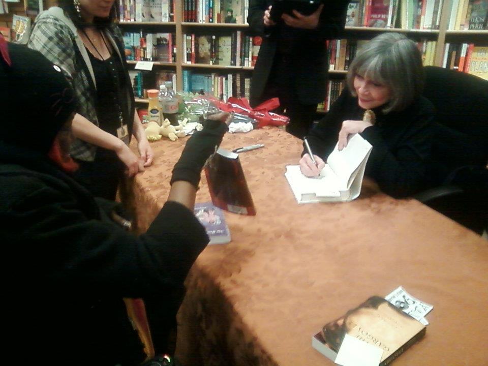This is a pretty adorable photo from a year ago today – today is February 24, my mom’s birthday, and last year Anne Rice was in San Francisco signing “The Wolf Gift” at Books Inc. at Opera Plaza – so me, mom (Carolyn Saulson), dad (Robert Saulson) and Michael Lee Totten stood in a line all the way around the corner past Max’s waiting to get our books signed. My dad got so intimidated he actually took off on his scooter wheelchair thing and flew back home to Ellis Street (after standing in line for an hour saying he was going to tell Anne Rice how awesome his daughter-the-writer was because – you know, parents. Gotta love em). My mom actually went in there and handed Anne Rice copies of two of my books while she was signing our respective copies of the Wolf Gift – something I’d never have the courage to do (again parents, you gotta love ’em) and Anne Rice did sign my book with these words “Blessings on your work! Thanks for your books” so you know I have that book practically framed. Heck, I’m surprised that I didn’t get that tattooed on my arm or something. It was awesome. So a year later – my father of course is gone. And that makes me sad. I am glad to have this happy memory of the time my parents and I spent together last February, though.