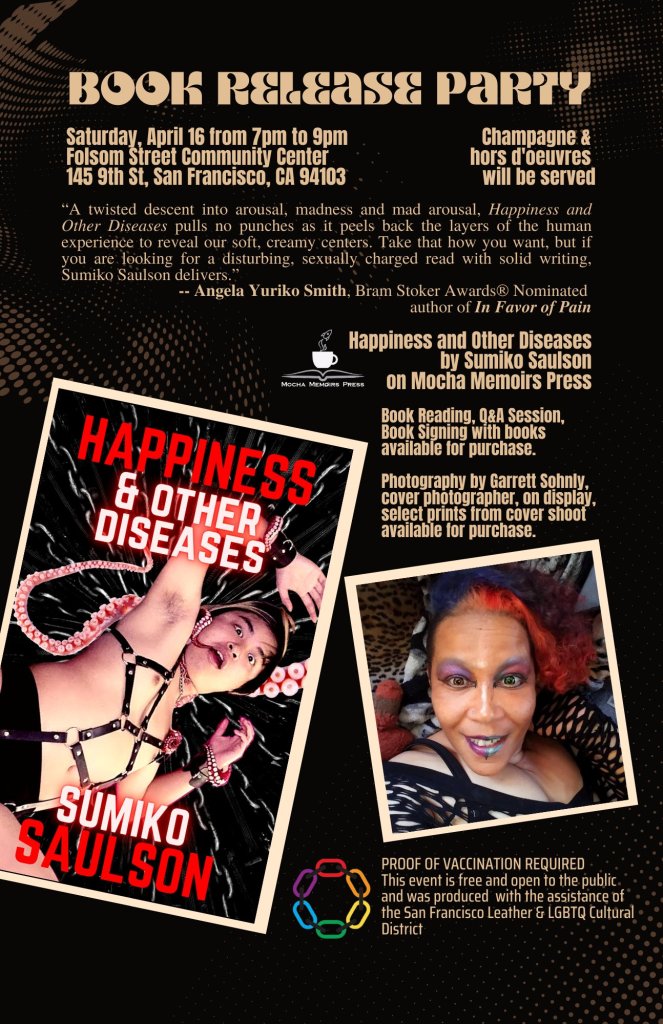 If you’re in San Francisco on Saturday, April 16th between 7pm and 9pm, I would like to invite you to the book release party for “Happiness and Other Diseases,” which is coming out on Mocha Memoirs Press on March 30. The book release party, which is being put on in conjuction with the LEATHER & LGBTQ Cultural District, will feature champagne and hors d’oeuvres, as well as a book reading, book signing with books available for purchase at $15 each. If you bring a book with you, I can also sign that.