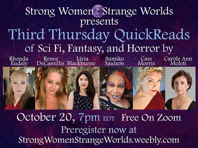 Join us the First Friday and Third Thursday of every month for a tasting menu of science fiction, fantasy, and horror stories written by women and non-binary authors. We’ll feature 6 authors (different authors each time) who will each have 8 minutes to tempt and tantalize you with their reading. Our readings are like Forrest Gump’s box of chocolates – you never know what you’ll get!
