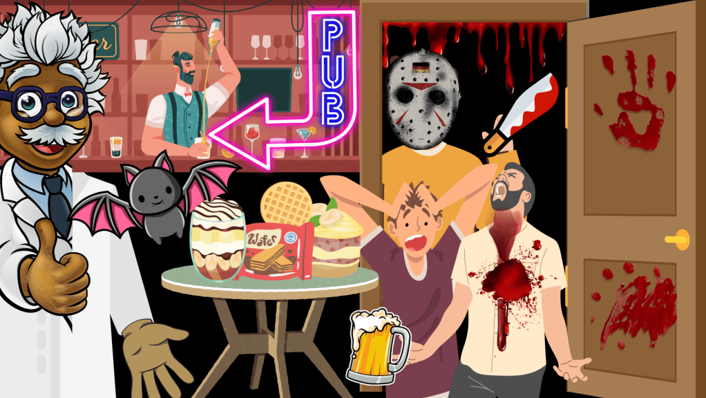 The rest of the patrons ran to escape, but they could not! Jason from Friday the 13th was in the door. He ran at Angus and chopped his head off. The hungry bat ran at it and ate the eye.