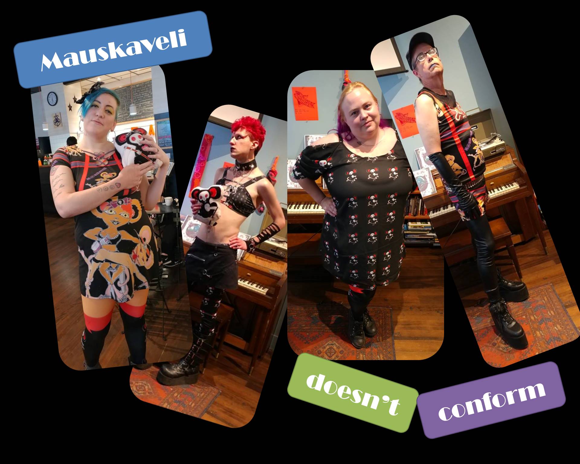 Mauskaveli is a comic about the adventures of a group of polyamorous, queer, and kinky anthropomorphic mice, centering around the title character Mauskaveli, her partners Count Slackula, Petricio, and Skunkmaus, her child, a necromancer named Death Angel, and their pet cat Dooky. Mauskaveli is a comic book about a group of kinky, queer, politically active polyamorous anthropomorphic mice. Their leader, Mistress Mauskaveli, escaped a biotech lab along with her boyfriends, Petricio and Rogue. All three mice were experimented on – Mauskaveli developed superior intelligence, Rogue regenerative powers, and Petricio, charisma. After they escape their extended polycule grew to include Petricio’s boyfriend Joe Squeaks and Mauskaveli’s girlfriend Skunkmaus. They have a pet catzbatz named Dooky, spontaneously generated from poop. Other characters include Joe Squeak’s sister Lovey Squeaks, her girlfriend Pinky La Rue and daughter Pip Squeaks – Death Angel’s girlfriend Mauztisha – Mauskaveli’s uncle Aviator Maus – a cosplayer named Tumimaus – Skunkmaus’ identical twin Skankmaus – Pretty Whiskers, Clawdia, and more!